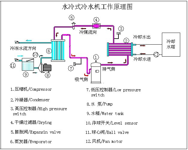 5、如冷水機組系統1冷媒(制冷劑,雪種)泄漏,制冷系統中某處,如毛細管,膨脹閥,干燥過濾大,等處有堵塞現象,造成制冷系統1低壓壓力過低,系統1低壓保護開關動作,正常時是常閉開關,動作后成為常開。